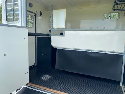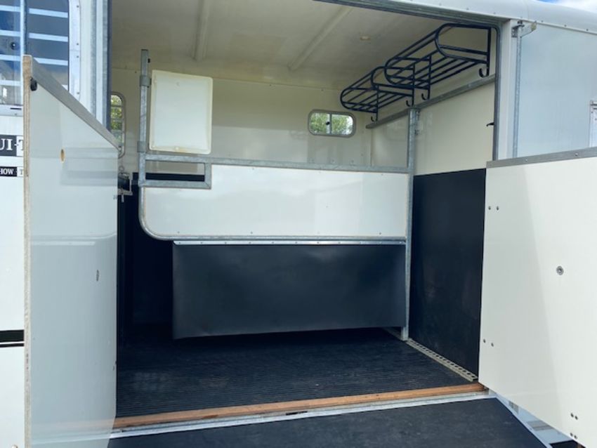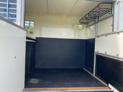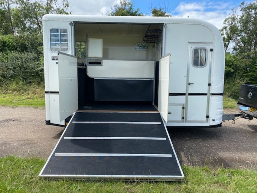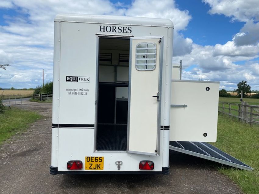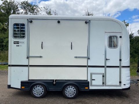 Equitrek Show Trekka M horse trailer with front window, carries two 16.2 horses, rear facing, very little use, has been stored indoors. Stored near Hoxne, Suffolk. No VAT on this item.