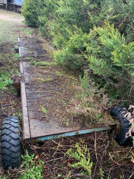 8 metre low trailer, suit sugar beet drill or similar. Metal work sound, but in need of some new timbers. Stored near Bungay.