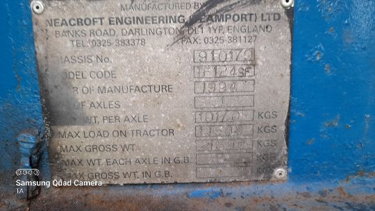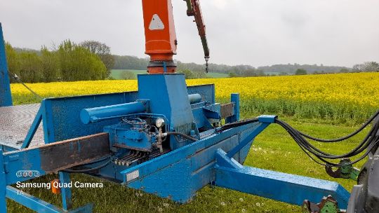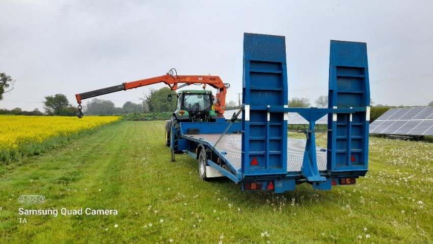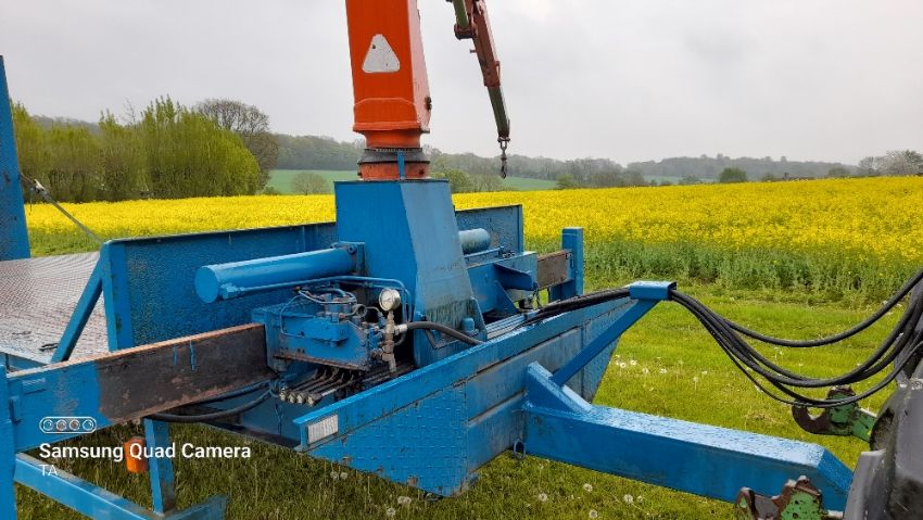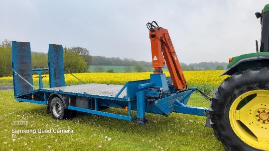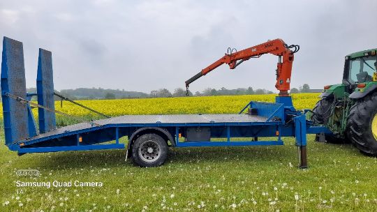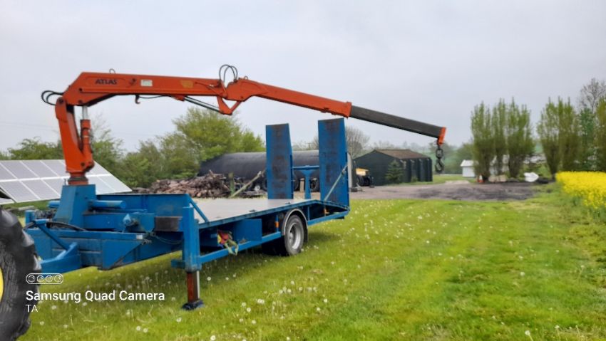 20ft beaver tailed crane trailer, atlas crane, adjustable ramps, hyd. Brakes, spare wheel, good working order. Stored near Eye, Suffolk.