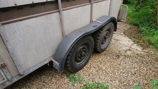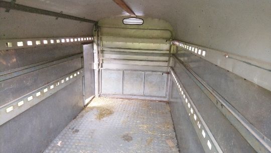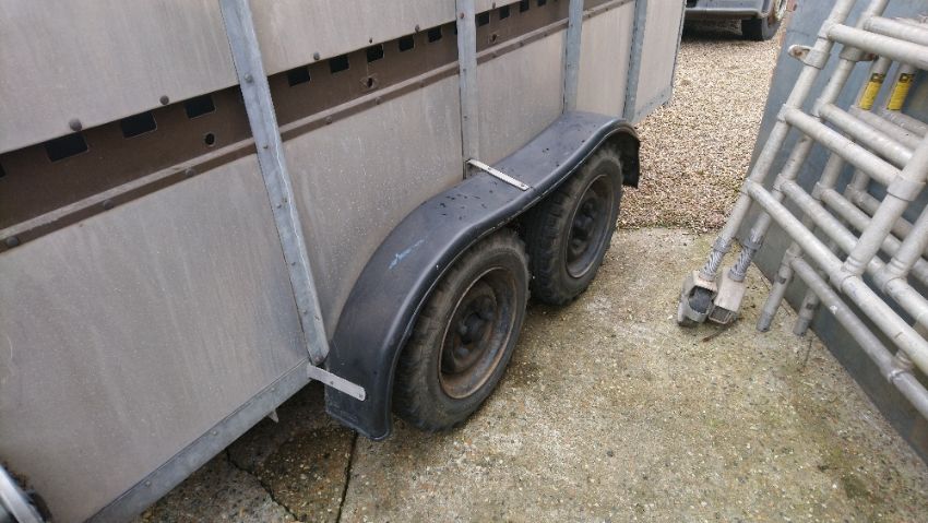 Bateson 1999 tandem axle livestock trailer, good tyres, solid metal floor. Stored near Laxfield, Suffolk.