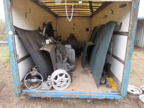 Container and contents, mostly Jaguar spares to include 2 x Jaguar bonnets and 1 x boot lid