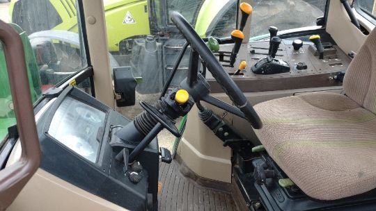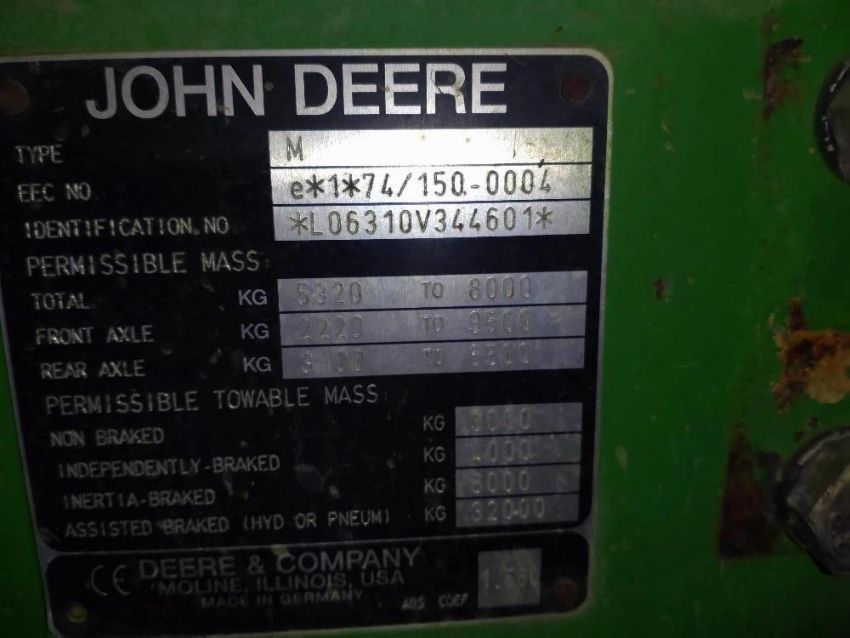 2002 John Deere 6310 4wd Tractor, 8,393 hours, Reg AP02 KPV, s/n L06310V344601, 450/65R24 Front wheels and tyres, 540/65R38 rear wheels and tyres, c/w 631 front end loader, pallet tines and dirt bucket.