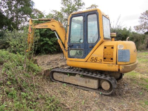 Hyundai 55-3 excavator comes with 3ft ditching bucket, 9" trench bucket, 5ft trench bucket and a 2ft digging bucket and 6ft levelling scrapper model ROBEL-55-3, 2,262 hours on clock, rubber tracks, cracked glass in the base of cab, rear levelling scraper